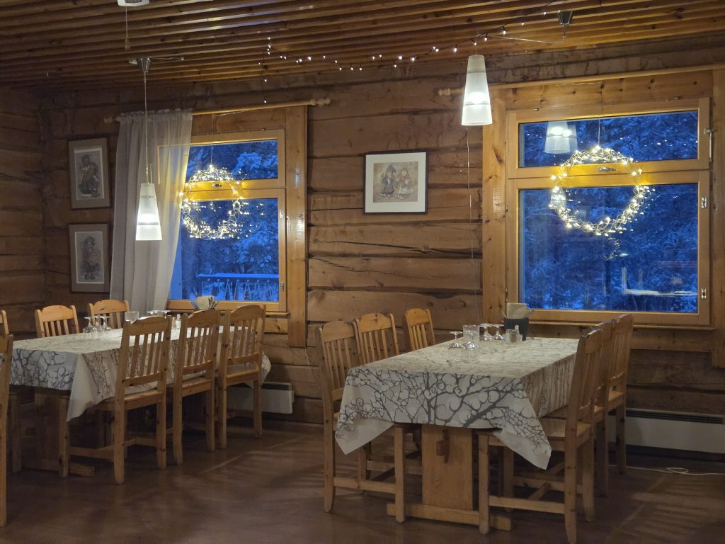 Our restaurant has 140 seats, including 60 in the dining room, which offers a beautiful view of the Kaamasjoki River. Guests can also dine on the outdoor terrace. You can stop by for coffee, play billiards, or simply watch TV while listening to the stories of local reindeer herders. The dining room is also available for private events, such as birthdays, Christmas parties, and more.